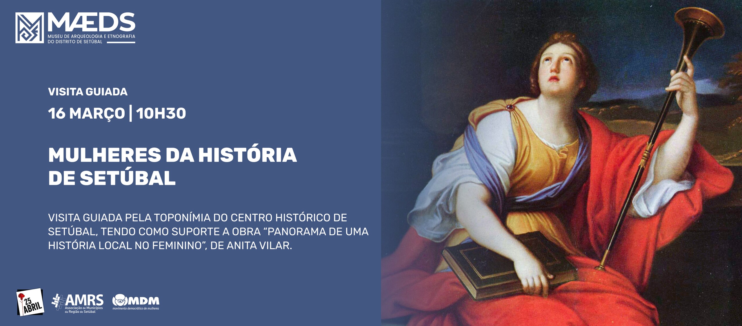 No âmbito das comemorações do Dia Internacional da Mulher, o MAEDS - Museu de Arqueologia e Etnografia do Distrito de Setúbal, em colaboração com o MDM - Movimento Democrático de Mulheres, realizam no dia 16 de março, pelas 10h30, uma visita guiada pelo Centro Histórico de Setúbal com a temática "Mulheres da História de Setúbal".