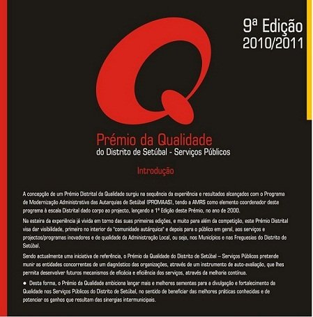 A AMRS disponibiliza para leitura e impressão o regulamento e o formulário relativos à 9.ª edição do Prémio da Qualidade do Distrito de Setúbal - Serviços Públicos.A data limite para entrega de candidaturas é no dia 29 de Outubro.